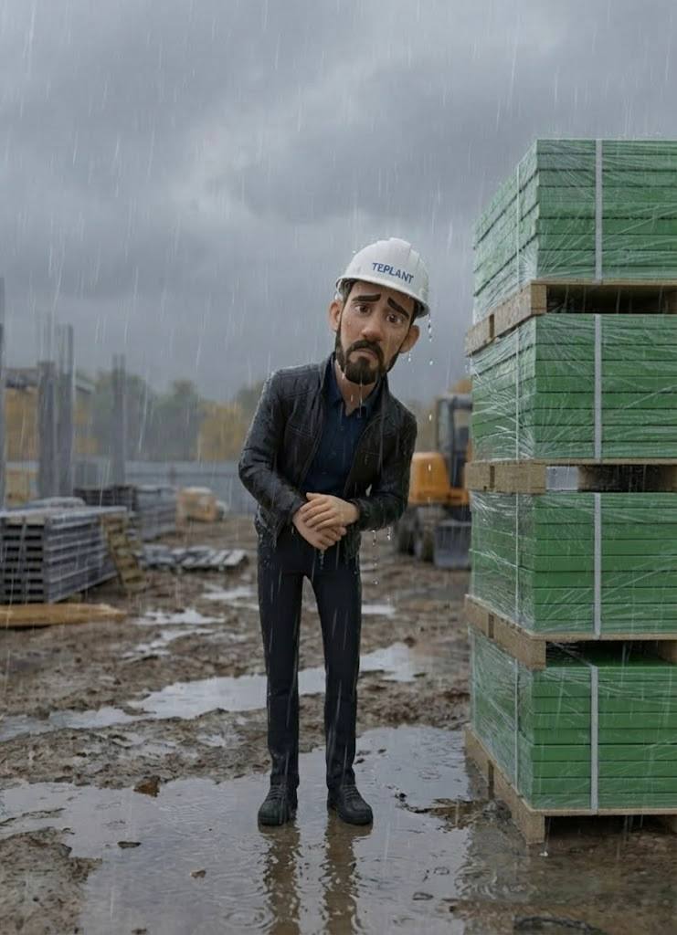При погрузке и перевозке упаковка панелей часто получает мелкие повреждения, поэтому уже не защищает от влаги полностью. Если такие пачки оставить под открытым небом, вода постепенно попадает внутрь и задерживается там — и утеплитель, и картон впитывают влагу. Получается эффект «парника»: внутри упаковки жарко и влажно, и это ускоряет разрушение покрытия.